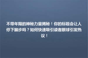 在互联网时代,文章标题的重要性不言而喻。你可能会发现,花了很多时间准备的优质内容,却因为标题平平无奇而无人问津。这是因为,一个吸引人的标题不仅能勾起读者的好奇心,还能提高点击率。你是否知道,标题不带年限可以让你的内容更加永恒,适合不同时间段的读者访问?本文将深入探讨这一小改变如何带来大效果。我们将分享一些实用的小技巧,帮助你挑选关键词、运用情感化语言,使标题更加引人注目。比如,如何将简单的描述转换成让人心动的疑问句,或者如何用数字和具体的承诺来吸引读者。在文章中,我们还会列举一些成功案例,帮助你更好地理解标题改进的具体效果。无论是博主、内容创作者还是企业主,这些技巧都能让你的标题瞬间脱颖而出,吸引更多的点击和互动。快来了解一下,这些简单但有效的标题策略是如何改变你内容的命运,让更多的读者走进你的世界,点击你的文章!